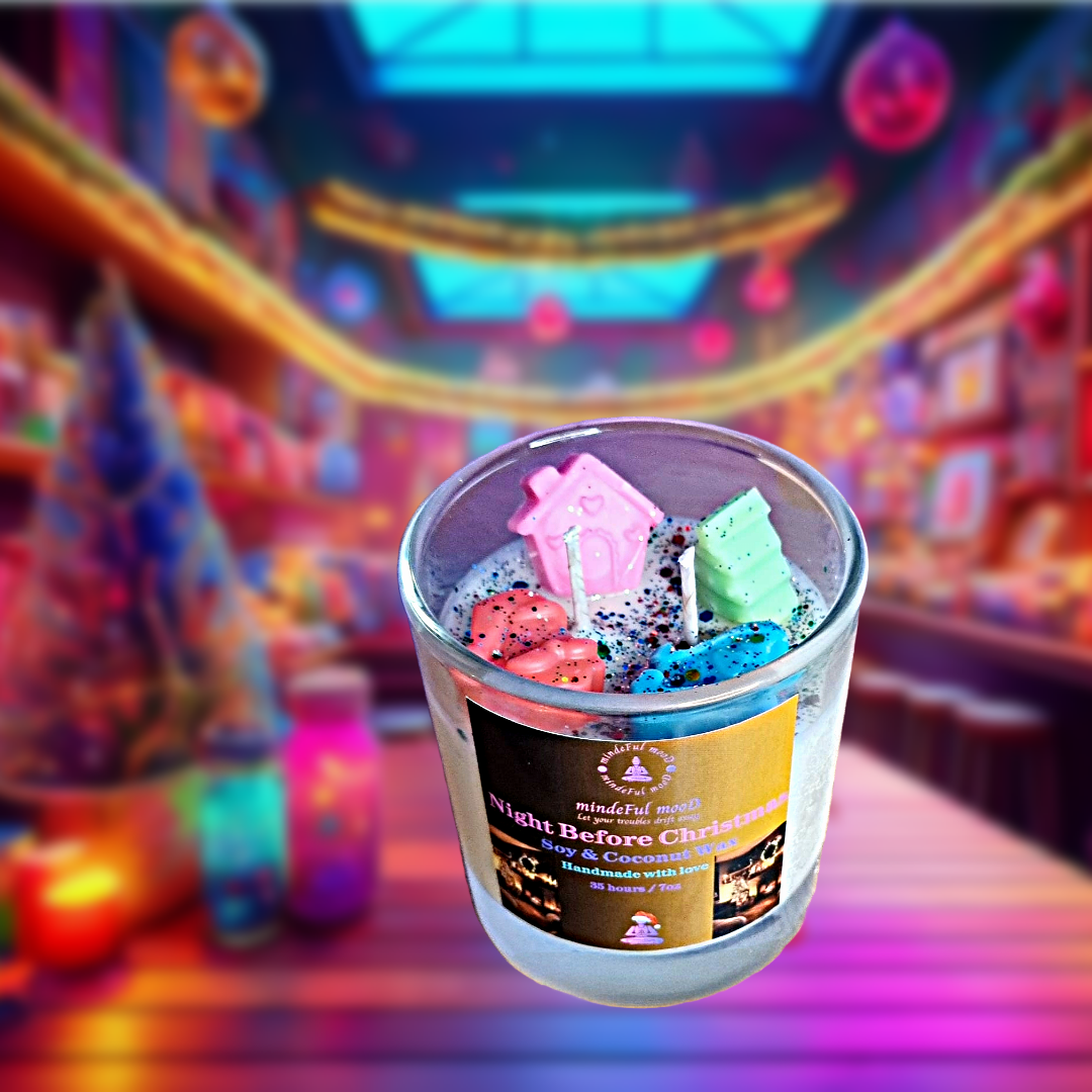 Night Before Christmas 30cl Candle, hand poured with love. 100% Vegan Friendly, free from Animal Cruelty and Eco Friendly. Soy and Coconut wax. Burn time 30-35 hours.